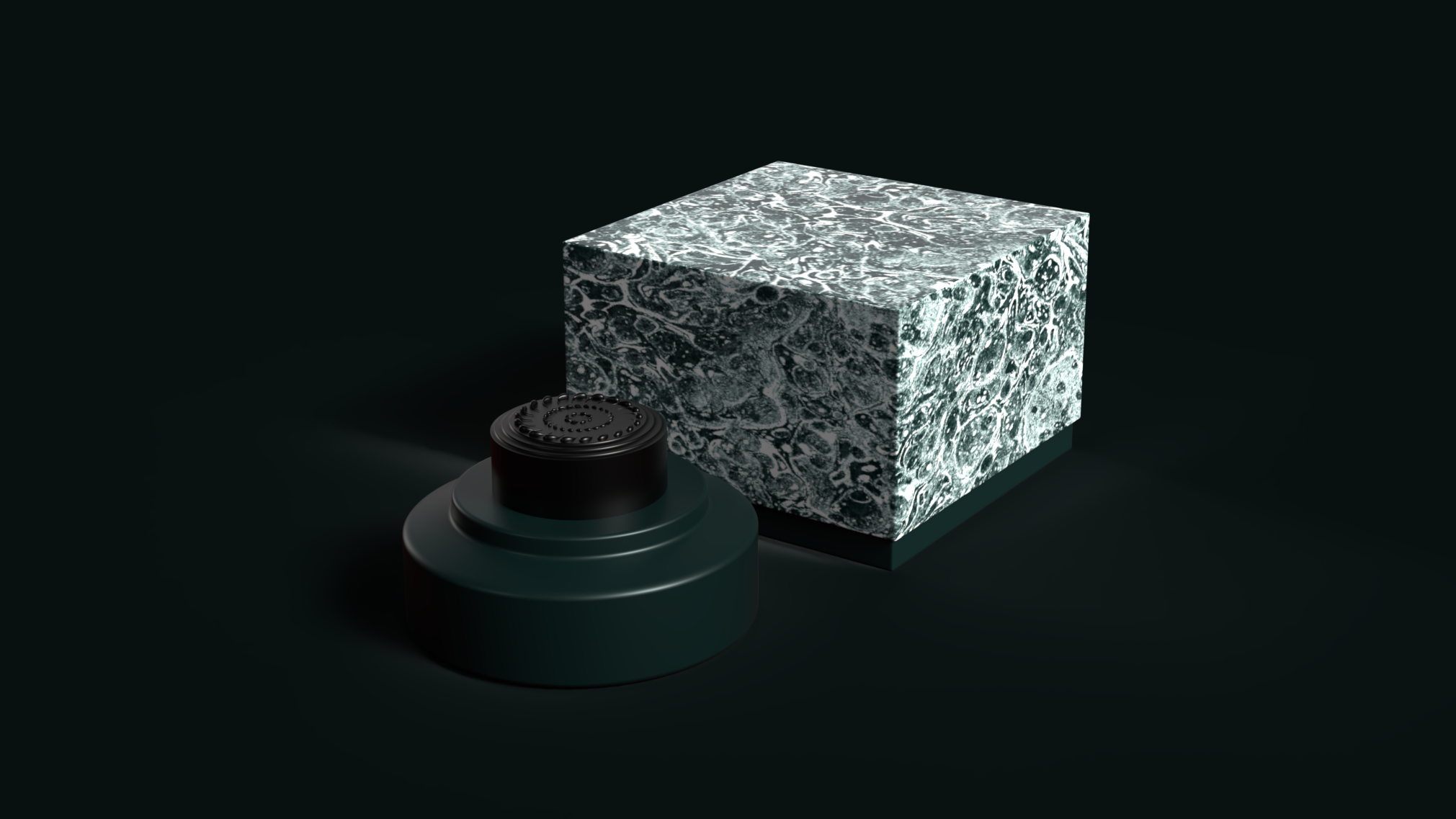 I designed a two- tiered, hollow disk-like vessel in Adobe Stager meant to impart the feeling of carrying a heavy river stone in one’s hand. It was important for the bottle to have both visual and physical weight. It is housed in a marbled box with discrete branding to encourage reuse.